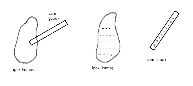 Cam çubuk ipek kumaşa sürtündüğünde cam çubuk artı ipek kumaş ise eksi yük ile yüklenir. Bu olayda cam çubuktan ipek kumaşa eksi yük geçişi olur.